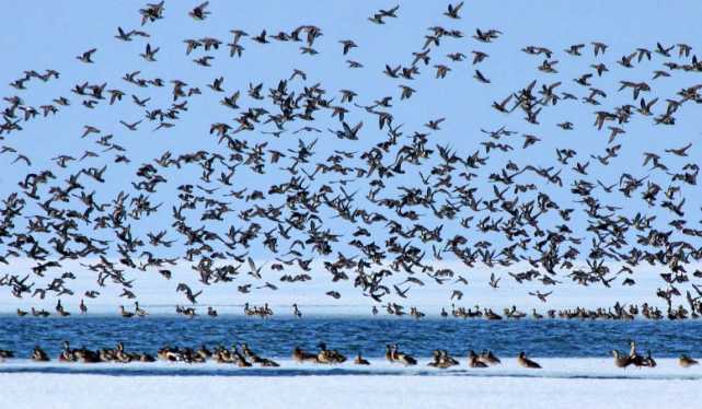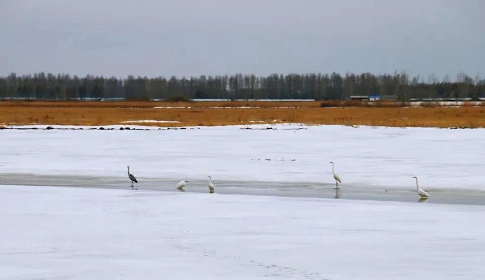 在雁窩島國家級生態(tài)濕地自然保護區(qū)內的冰面上,白鸛、灰鸛還有小水雞,三五一組,有的悠閑散步,有的仰頭眺望,有的在融化的雪水中覓食,還有的在低空盤旋。比往年提前10天到來的候鳥,為雁窩島增添了初春的氣息和生機。