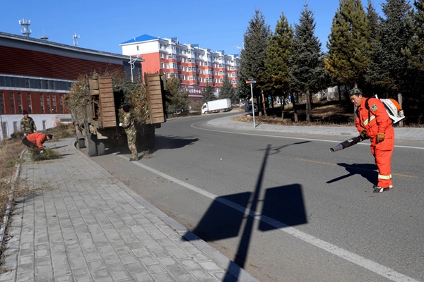 圖為阿木爾林業(yè)局森林消防大隊專業(yè)撲火隊員將修剪下來的樹枝裝車運(yùn)走(王力/攝)