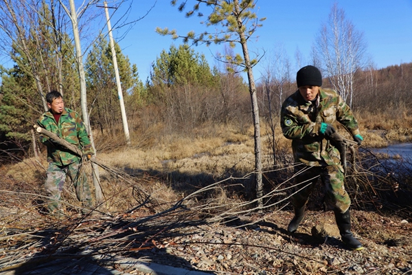 圖為阿木爾林業(yè)局防火辦黨總支黨員突擊隊帶領(lǐng)專業(yè)撲火隊員在修剪北極植物園樹枝(王力/攝)