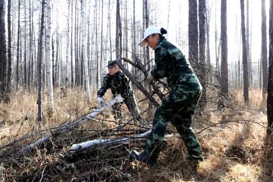 在撫育作業(yè)現(xiàn)地,寒冷的風吹拂著干部職工的面龐,腳下過膝高的雜草直往鞋里鉆,一不小心就會踩進冰冷的積水中。雖然工作環(huán)境較為艱苦,可沒有一個人掉隊退出,大家沒有牢騷,沒有埋怨,認真撿拾著被壓木、腐朽木、枯死木、站桿、藤條及老舊伐根等影響中幼林生長的木材。雖然機關干部職工大多數(shù)人以前都沒有從事過森林撫育工作,但經(jīng)過前期培訓和現(xiàn)地實踐,大家對撫育技術操作要領很快掌握嫻熟,一字排開有序地清林歸堆,彼此間默契呼應,不一會現(xiàn)地就出現(xiàn)了橫山碼放整齊的枝丫堆。