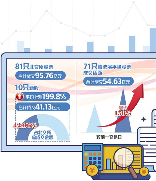 北交所首個(gè)交易日運(yùn)行平穩(wěn),81只股票合計(jì)成交95.76億元。首批上市交易的10只新股全線上揚(yáng),盤(pán)中均觸發(fā)兩次臨時(shí)停牌。截至收盤(pán),10只新股平均較發(fā)行價(jià)上漲199.80%。71只從精選層平移至北交所的股票漲跌互現(xiàn)。