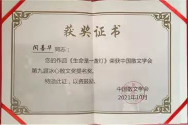 在幾十年的文學(xué)創(chuàng)作和編輯工作中,她不斷堅(jiān)持學(xué)習(xí)提高,筆耕不輟,執(zhí)著堅(jiān)守。在2020年10月發(fā)表在《北極光》上的散文《生命是一盞燈》,因主題對生命的感悟,用縱橫寬泛的思路、真摯的情感,流暢的文筆,經(jīng)評委嚴(yán)格評審,最終脫穎而出,獲得本屆冰心散文獎單篇提名獎。這對于一直深居邊陲縣城的一名作家,能邁進(jìn)冰心散文獎這中國散文最高獎的大門,是一個非常難得的殊榮。