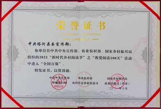 塔河縣委宣傳部在2020、2021連續(xù)兩年榮獲“新時(shí)代鄉(xiāng)村閱讀季”全國(guó)百強(qiáng)榮譽(yù)稱號(hào),