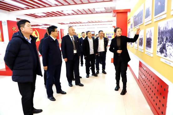 阿木爾林業(yè)局黨委委員、組織部部長王立昆(左二),林業(yè)局副局長劉鵬(左一),以及多種經(jīng)營公司黨員參觀局史館(王力 攝)