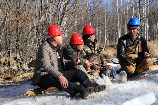 阿木爾林業(yè)局多種經(jīng)營公司干部職工在修復(fù)水毀橋時利用歇息時間研究下步工作(王力 攝)