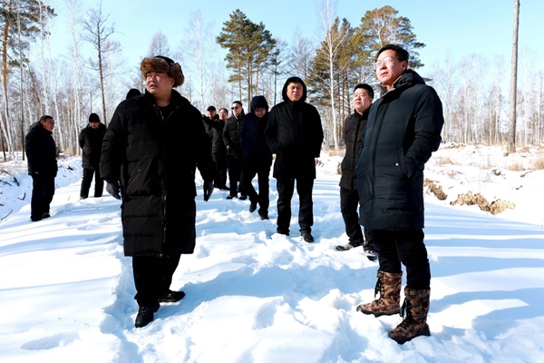 阿木爾林業(yè)局由林業(yè)局黨委書記胡守慶(最前排左),林業(yè)局黨委副書記、局長韓鳳泉(最前排右)組成體驗式調(diào)研組,深入北極島調(diào)研旅游產(chǎn)業(yè)(王力 攝)