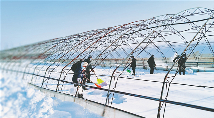 在綏化市慶安縣久勝鎮(zhèn)久宏園區(qū)——國家現(xiàn)代農(nóng)業(yè)科技示范展示基地,40多名村民正在清雪扣棚。預(yù)計在15天內(nèi)園區(qū)內(nèi)的80棟自動化水稻育苗大棚將全部完成清雪扣棚作業(yè)。