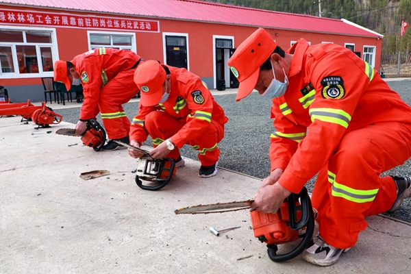阿木爾林業(yè)局綠林林場專業(yè)撲火隊員在進(jìn)行風(fēng)力滅火機(jī)、油鋸的拆裝維修使用比賽(王力 攝)