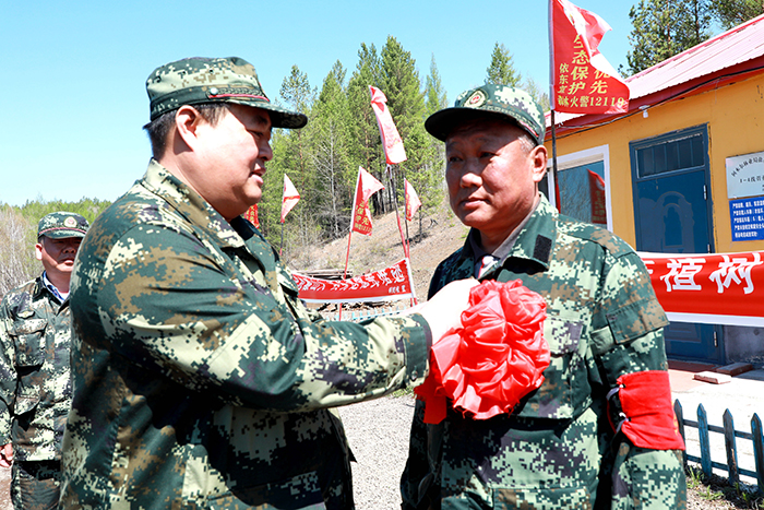 阿木爾林業(yè)局黨委書(shū)記胡守慶(左)為依東林場(chǎng)即將退休的共產(chǎn)黨員、管護(hù)員滿德江(右)戴上“光榮花”。(王力 攝)
