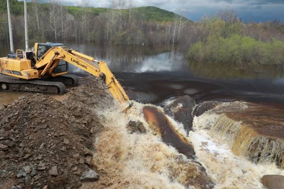 阿木爾林業(yè)局調(diào)派大型機械設(shè)備,挖開楚龍溝河大橋臨時便道,進行泄洪,確保G111國道安全(王力 攝)