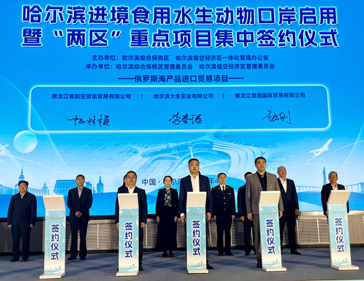 同日,哈爾濱進(jìn)境食用水生動(dòng)物口岸啟用暨“兩區(qū)”重點(diǎn)項(xiàng)目集中簽約儀式在哈爾濱臨空經(jīng)濟(jì)區(qū)舉行?!皟蓞^(qū)”一體化辦公室主任介紹了哈爾濱進(jìn)境食用水生動(dòng)物指定監(jiān)管場地和保稅航油項(xiàng)目基本情況。