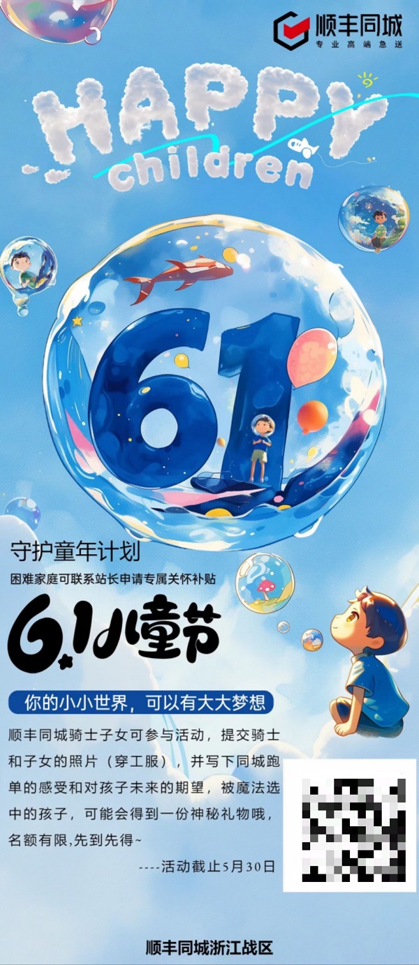 為慶祝“六一”兒童節(jié)的到來(lái),順豐同城在全國(guó)范圍內(nèi)精心舉辦了系列活動(dòng)?!傲弧鼻跋Γ瑸轶w恤山區(qū)留守兒童及困難家庭兒童,順豐同城在東北、廣州、佛山為孩子們送上了別具心意的禮物和關(guān)懷;為了給“騎士”和孩子們創(chuàng)造更多美好回憶,順豐同城在西北、深圳、東莞開(kāi)展了形式多樣的線下騎士親子活動(dòng),在河南、湖北、湖南聯(lián)合當(dāng)?shù)佧湲?dāng)勞舉辦了多場(chǎng)麥當(dāng)勞親子嘉年華活動(dòng),并在浙江推出“守護(hù)童年計(jì)劃”線上活動(dòng),“騎士”可通過(guò)分享親子合照、寫(xiě)下對(duì)孩子的成長(zhǎng)寄語(yǔ)贏取獎(jiǎng)勵(lì)。此外,“六一”兒童節(jié)當(dāng)天,順豐同城還發(fā)起“曬親子合影,贏神秘好禮”線上活動(dòng),“騎士”通過(guò)視頻號(hào)發(fā)布親子照片并贏取神秘大禮。