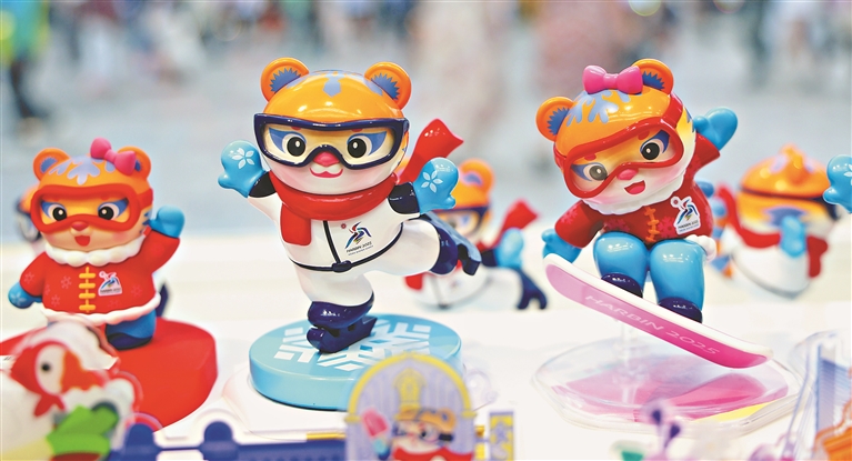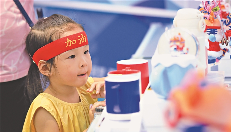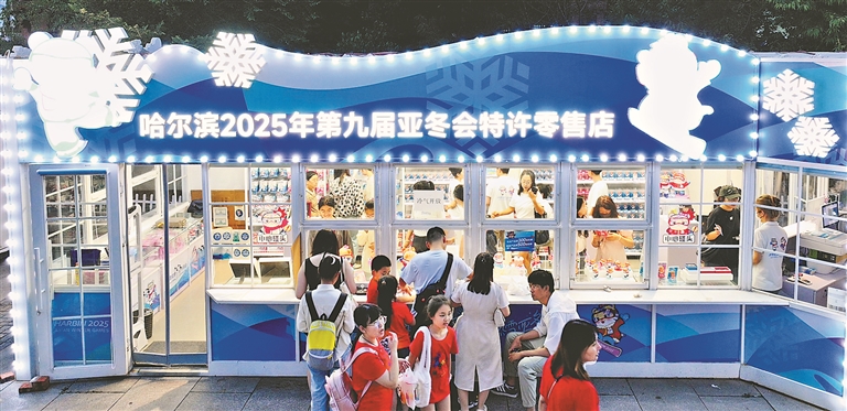 6月29日,第九屆亞冬會(huì)特許零售店哈爾濱索菲亞教堂店,游客在琳瑯滿(mǎn)目的貨品中挑選心儀的款式。