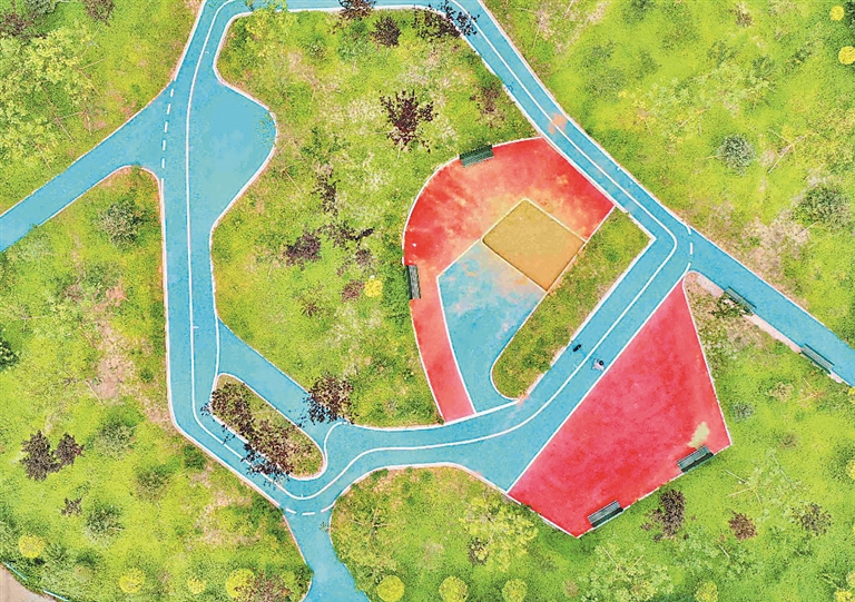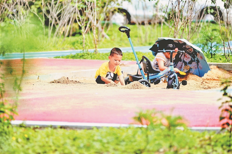 這處“口袋公園”占地面積數(shù)百平方米,里面有供人們散步聊天的休閑區(qū),有供孩子們玩樂的“微型沙灘”,花草樹木生長(zhǎng)茂盛,景色很美。
