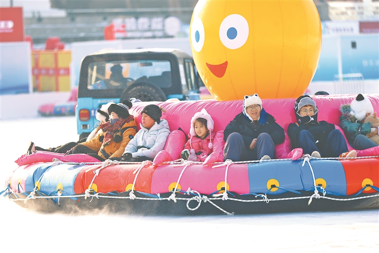 記者站在堤壩望向松花江面看到,江面被有序劃分為多片區(qū)域,每片區(qū)域都是一個歡樂場,游客可以體驗“瘋狂八爪魚”、大滑梯、龐巴迪賽車、滑冰,乘坐馬車、冰雪龍舟游覽園區(qū),還可以走進“馴鹿部落”體驗喂食馴鹿的樂趣。同時,熱飲屋、文創(chuàng)店、寄存處、餐飲店、防寒用品攤位等相關配套服務一應俱全。