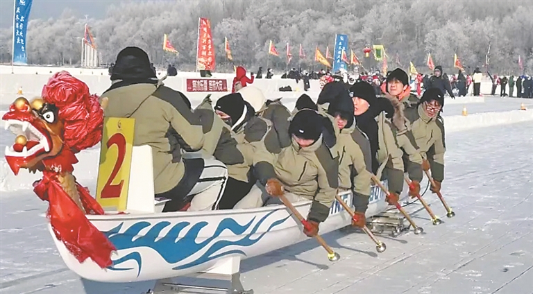 伴隨著動感的音樂聲和歡呼聲,冰面之上百釬齊發(fā),龍舟疾馳。隊員們劃槳動作整齊劃一,鑼鼓聲、吶喊聲形成了一曲激昂的冬日交響樂。當冠軍隊伍沖線的一刻,現(xiàn)場爆發(fā)出更熱烈的歡呼聲,豪邁的氣勢與聲浪響徹萬寶湖上空。