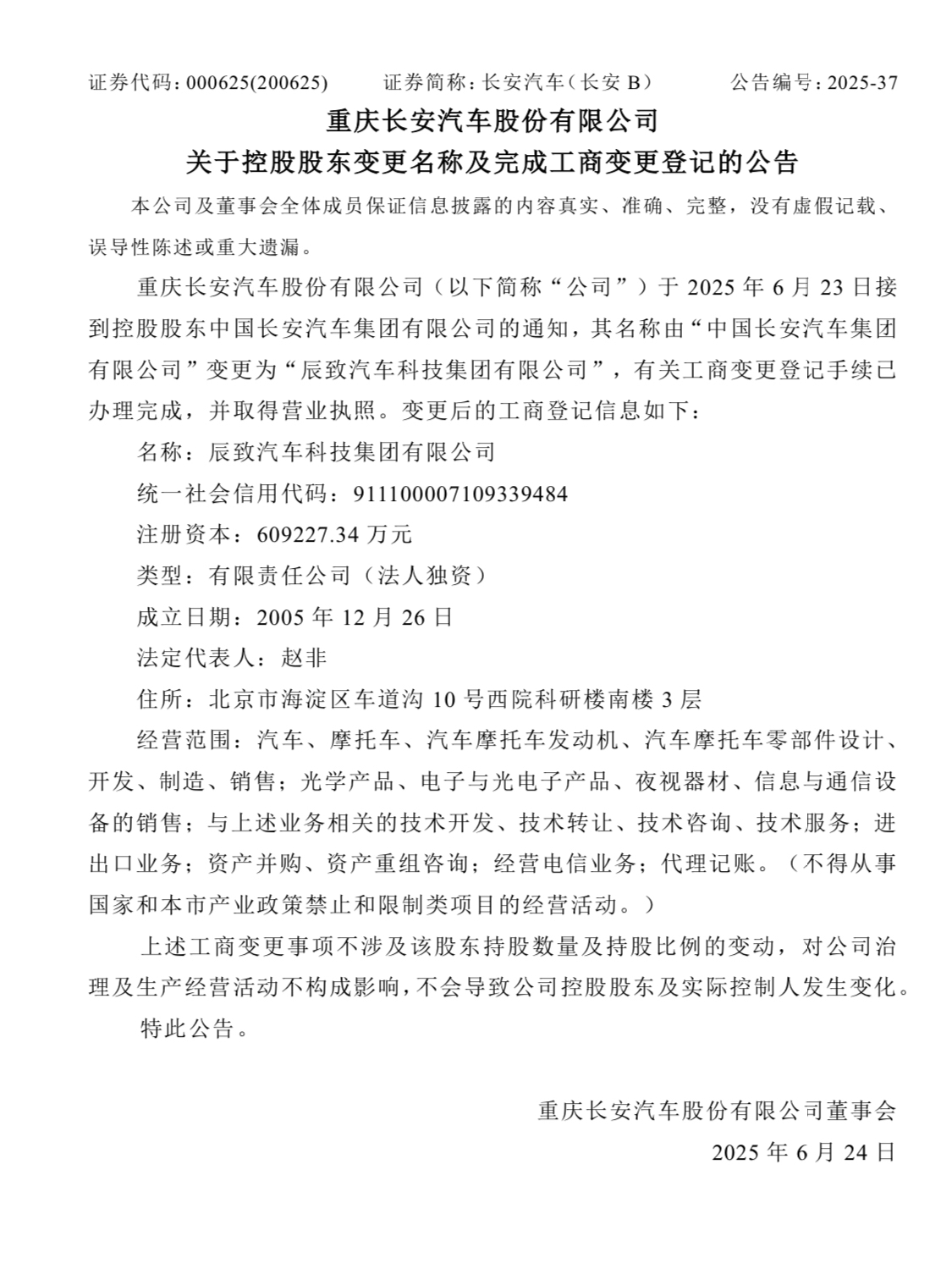 6月23日晚間,重慶長(zhǎng)安汽車股份有限公司(以下簡(jiǎn)稱“長(zhǎng)安汽車”;000625)發(fā)布公告稱,公司接到控股股東中國(guó)長(zhǎng)安汽車集團(tuán)有限公司通知,其名稱由“中國(guó)長(zhǎng)安汽車集團(tuán)有限公司”變更為“辰致汽車科技集團(tuán)有限公司”,并已完成工商變更登記手續(xù)。