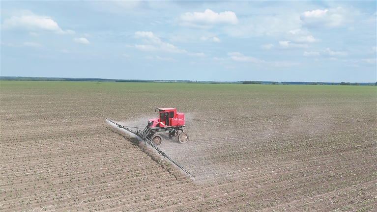 在慶安縣建民鄉(xiāng)玉米種植地塊,兩臺高桿噴霧機與一臺大馬力拖拉機協(xié)同作業(yè),成為田間“主角”。通過可伸展機械臂,一臺高桿噴霧機單次可為40行玉米精準噴施藥劑,同時最大程度降低風(fēng)力影響,高效完成滅草任務(wù)?!拔覀兞⒇S家庭農(nóng)場有9000多畝地,現(xiàn)在一臺高架車一天能作業(yè)1000畝,4臺機器兩三天就能完成作業(yè)?!苯襦l(xiāng)農(nóng)戶劉立豐感慨道,“小農(nóng)機一天也就作業(yè)百八十畝,這大農(nóng)機速度快了10倍?!痹趹c安縣國家現(xiàn)代農(nóng)業(yè)科技示范展示基地的水稻田里,無人機手正操控滿載分蘗肥的無人機平穩(wěn)穿梭。依托北斗導(dǎo)航精準定位,肥料被均勻噴灑在稻田中?!皺C械化施肥每畝僅需0.3元,成本是人工撒施的1/5,效率更是傳統(tǒng)人工的5倍以上。”慶安縣農(nóng)業(yè)技術(shù)推廣中心主任范軍介紹,機械噴灑不僅降低成本,更實現(xiàn)了肥料的精準分布,讓每株秧苗都能均衡“吃”到養(yǎng)分。