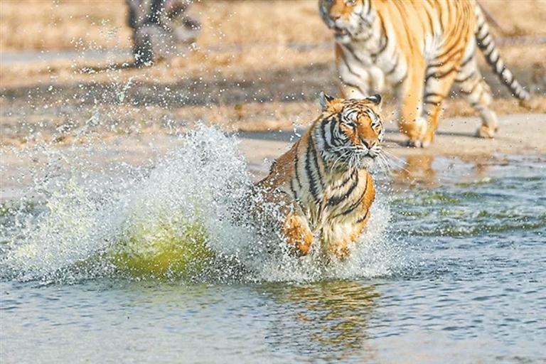 為提高游客觀賞體驗(yàn),園區(qū)通過(guò)工作車(chē)、無(wú)人機(jī)等多種方式,引導(dǎo)東北虎進(jìn)行水中捕食等,激發(fā)東北虎的野性與活力的同時(shí),為游客呈現(xiàn)一場(chǎng)真實(shí)、震撼的視覺(jué)盛宴。