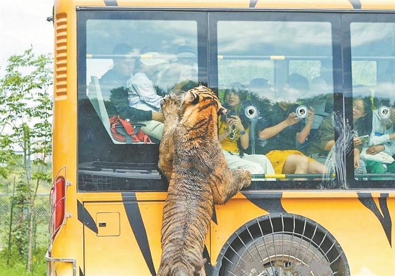 在驚險(xiǎn)觀光車(chē)上,游客可以通過(guò)特制裝置給成年虎投喂食物,體驗(yàn)“虎口投食”的刺激?!皬膩?lái)沒(méi)想過(guò)能這么近距離接觸東北虎,看著它從我手中的夾子吃肉,既緊張又激動(dòng)!”來(lái)自上海的大學(xué)生語(yǔ)氣難掩興奮。