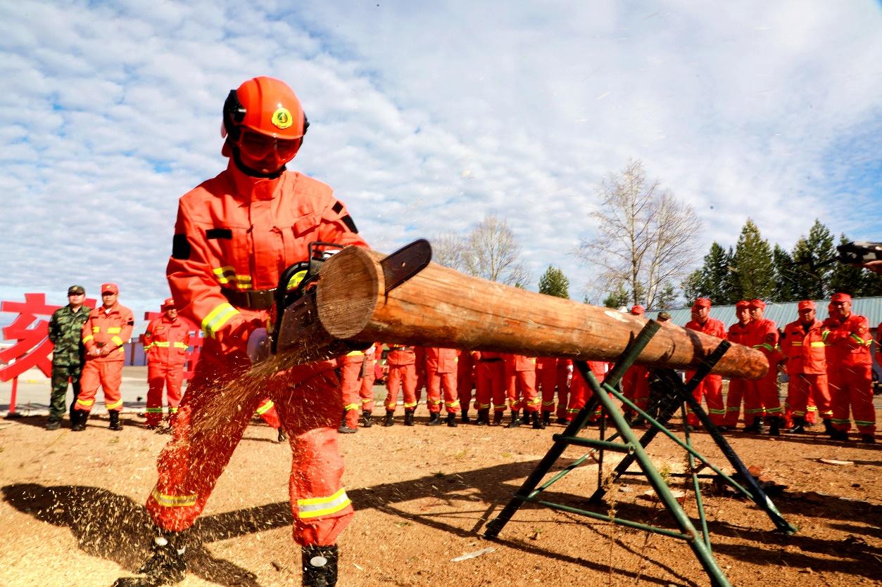 阿木爾林業(yè)局撲火專業(yè)隊員在進行油鋸割木競賽(王力 攝)