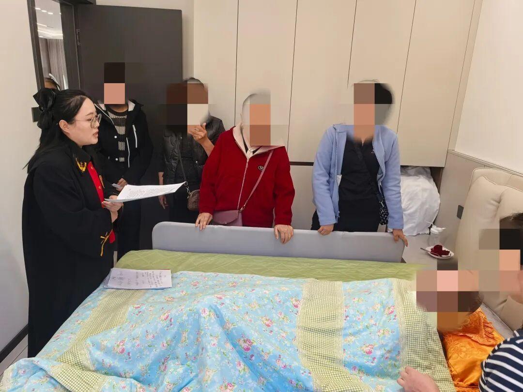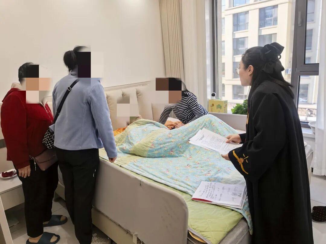 開庭當(dāng)天,干警們一進老人家門,就忙著搭建“臨時法庭”;法官沒有用急促的問話推進流程,反而把語速放慢了兩倍,拉著老人的手耐心傾聽——這份“把當(dāng)事人當(dāng)家人”的細致,漸漸融化了老兩口心中的芥蒂,讓他們愿意敞開心扉溝通。調(diào)解結(jié)束后,法官特意蹲在張爺爺?shù)牟〈策叾冢骸昂罄m(xù)的法律文書我們會直接送過來,您和阿姨要是有任何疑問,隨時給我們打電話,不用來回跑法院。”聽到這話,張爺爺看著干警們收拾東西的背影,渾濁的眼睛里忽然泛起了微光,他輕輕吐出兩個字:“謝謝”。這簡單的兩個字,藏著老人及家人對“司法不缺位”的深深感激,更映出了人民群眾對“司法為民”的熱切期盼。