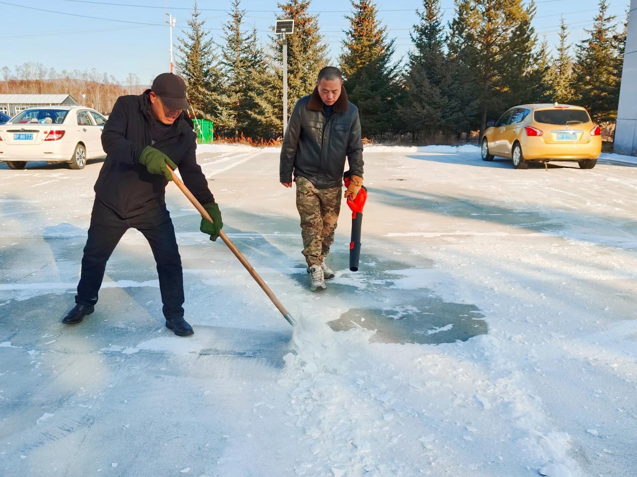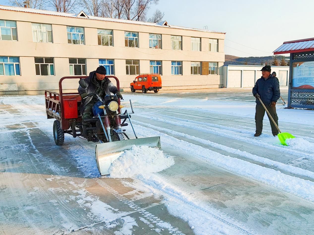 清雪現(xiàn)場,干部職工們嚴(yán)格遵循“即下即清、雪停路凈”的原則,不畏凜冽寒風(fēng),迅速投入戰(zhàn)斗。大家分工協(xié)作,形成了“機(jī)械+人工”的高效清雪模式。職工們各展所長,有人駕駛自制清雪車清理積雪,有人用推雪板歸集散雪,還有人手持雪鏟、吹雪機(jī)細(xì)致清理人行道縫隙等邊角區(qū)域。經(jīng)過近3小時(shí)的奮戰(zhàn),林場責(zé)任區(qū)內(nèi)的積雪被清除干凈,露出了整潔的路面和暢通的通道,為職工群眾和過往車輛安全通行清出了一片“平安路”。